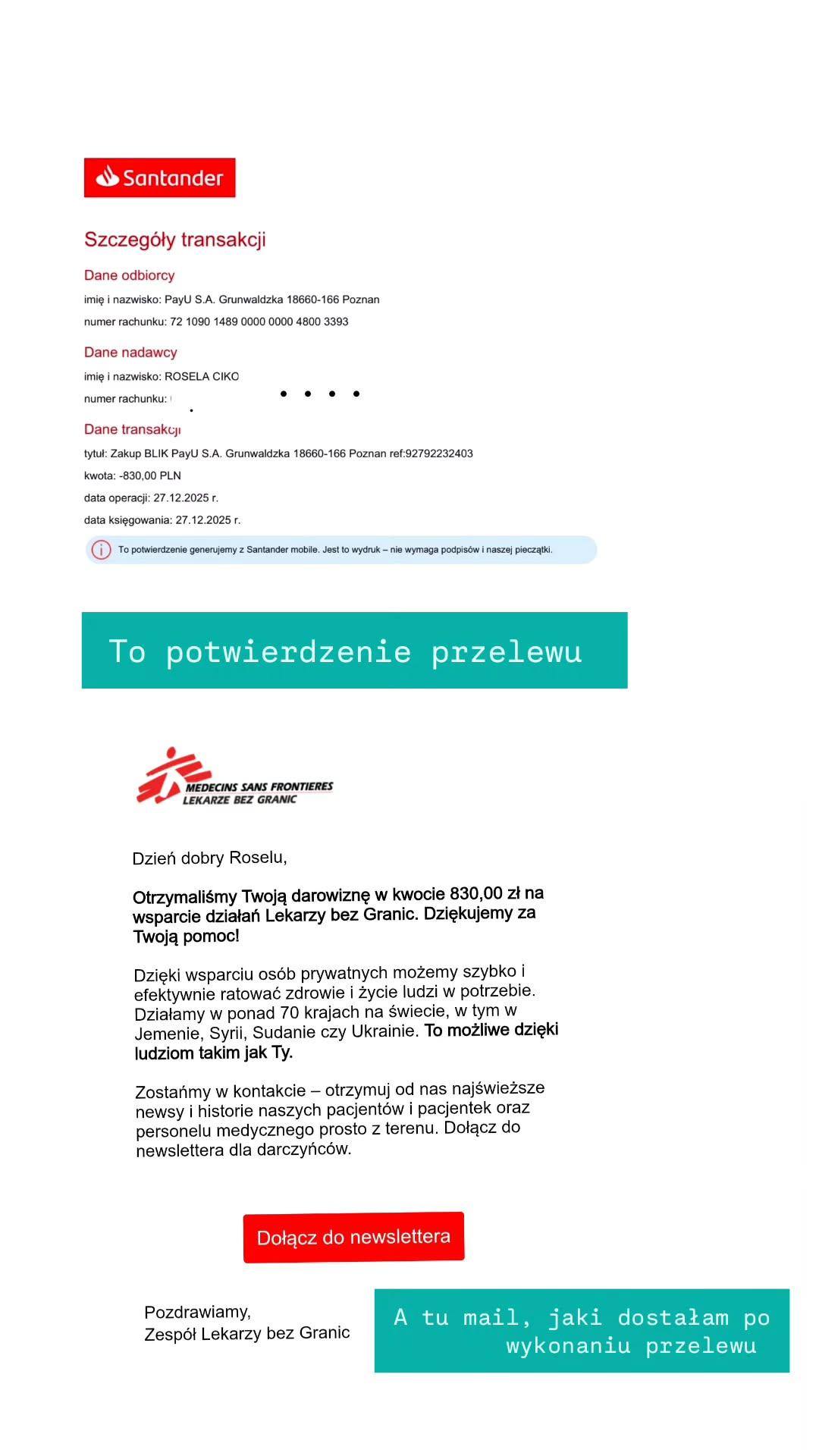 Na drugim zdjęciu potwierdzenie przelewu i mail, jaki dostałam.