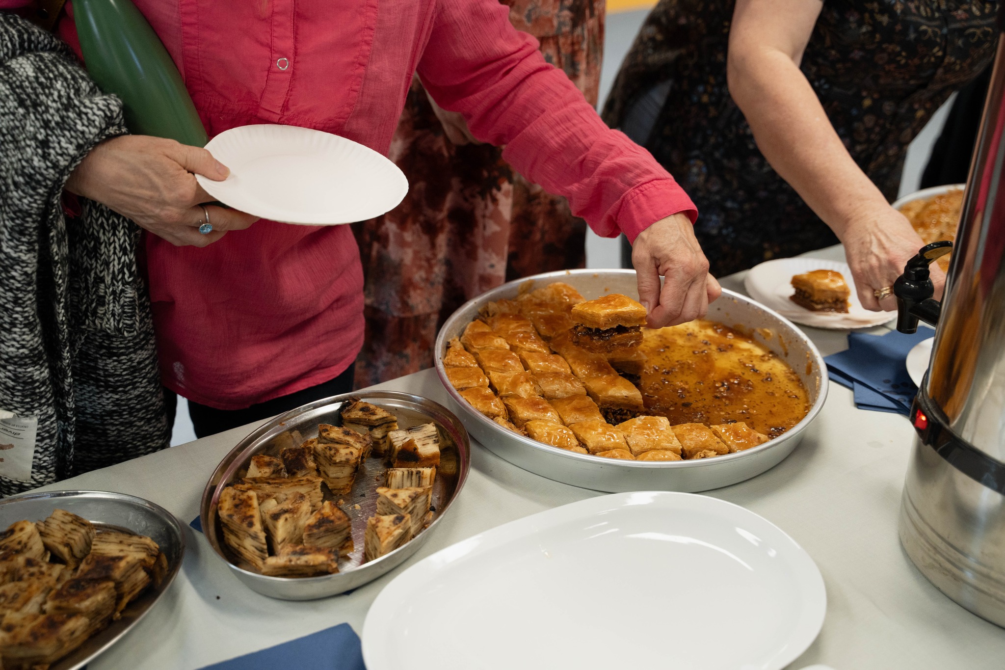 Wspólnie gotowaliśmy fli z Bleriną – doświadczoną cukierniczką z Prizrenu, która specjalnie dla nas przyjechała do Wrocławia. Fli to tradycyjne danie z północy Albanii i Kosowa – symbol góralskiej gościnności. Chrupiące na wierzchu, miękkie w środku, powstaje z prostych składników, dostępnych nawet w małych pasterskich społecznościach w Górach Przeklętych. To wielowarstwowe ciasto pieczone powoli, warstwa po warstwie przekładane klarowanym masłem i śmietaną, często przy ognisku – w tańcu i śpiewie. Blerina przygotowała też aromatyczną baklawę, którą częstowaliśmy gości, serwując ją razem ze świeżo zaparzoną kawą z kardamonem.